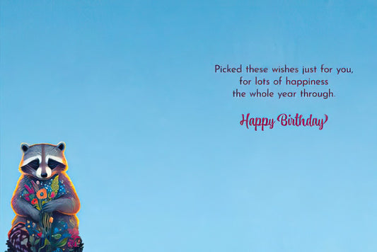 Cute Raccoon with Flowers Happy Birthday Card | Cute Birthday Greeting Card