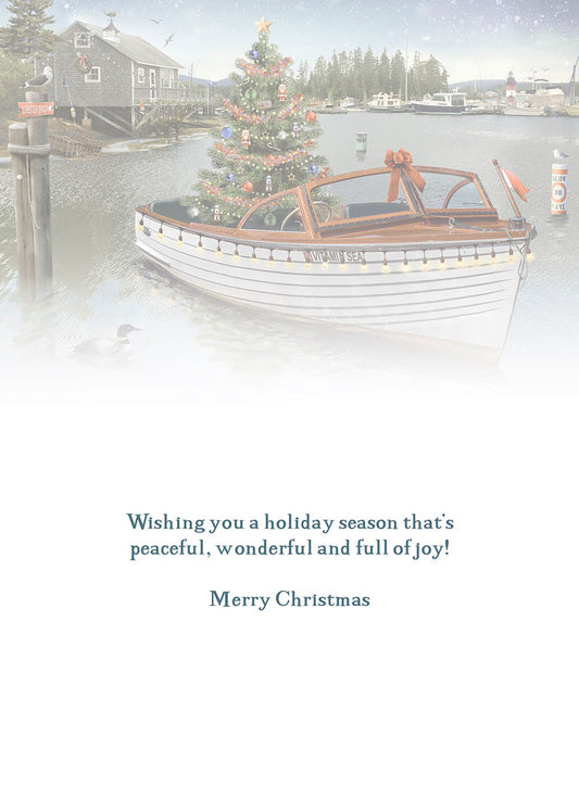 Xmas Tree Adrift On Boat Near Shore Christmas Card Single