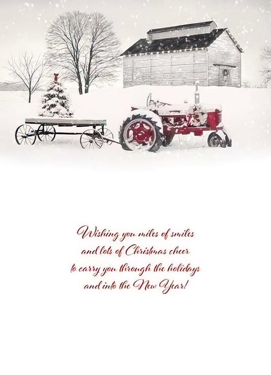 Miles of Smiles Red Tractor Snowy Farm Christmas Card