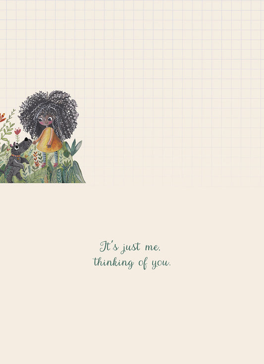 Cute Curly Haired Girl & Dog Friendship Card in Flower Field | Cute Friendship Greeting Card