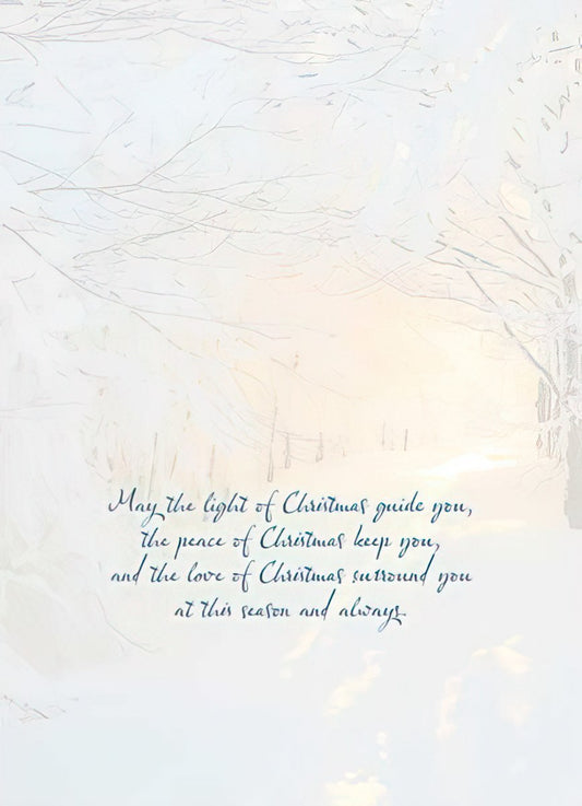 Snowy Tree-lined Road with Bright Light Christmas Card