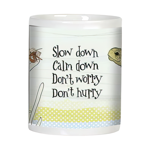 These 12-oz ceramic mugs with easy-grip handles are dishwasher and microwave safe and feature unique designs with delightful sayings.