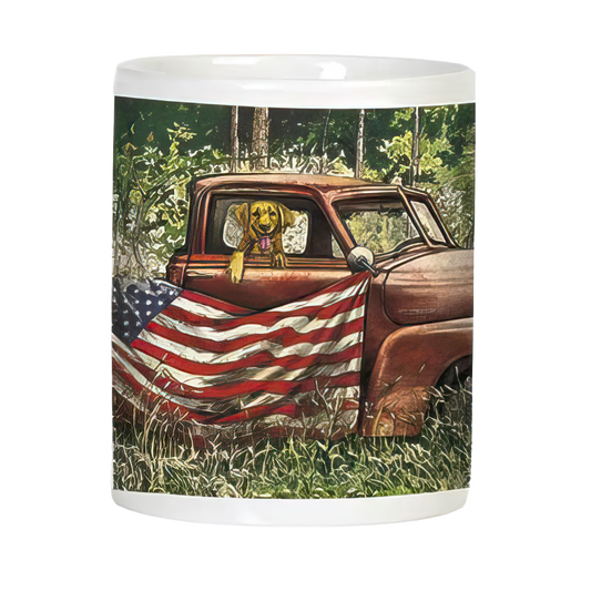 General American Flag Dog & Classic Pick-up Truck Mug | Lighthearted Mug