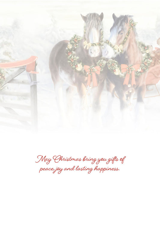 Season's Greetings Horses Pulling Sled Premium Embossed Christmas Card