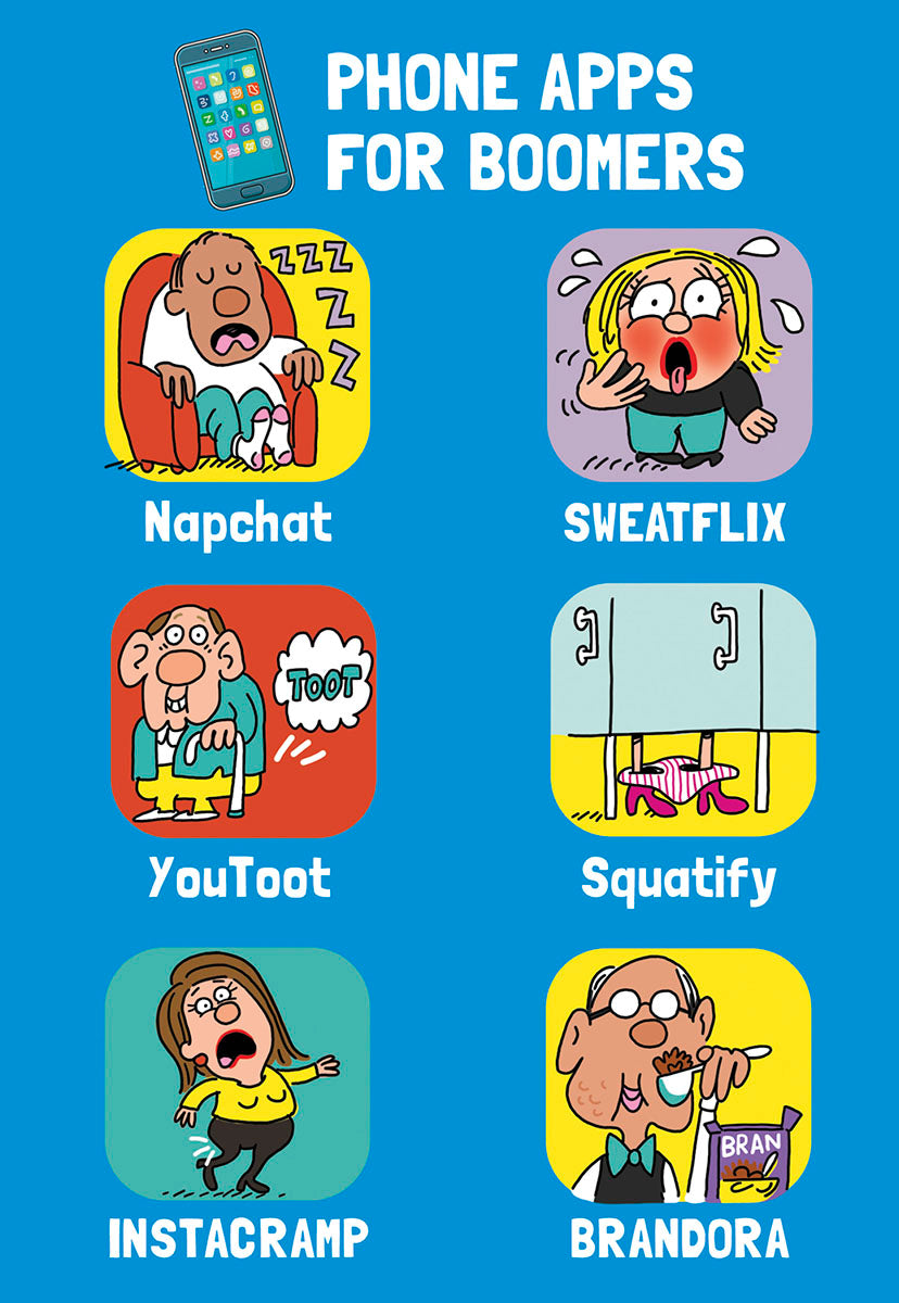 Front: Phone Apps For Boomers Napchat Sweatflix YouToot Squatify Instacramp Brandora