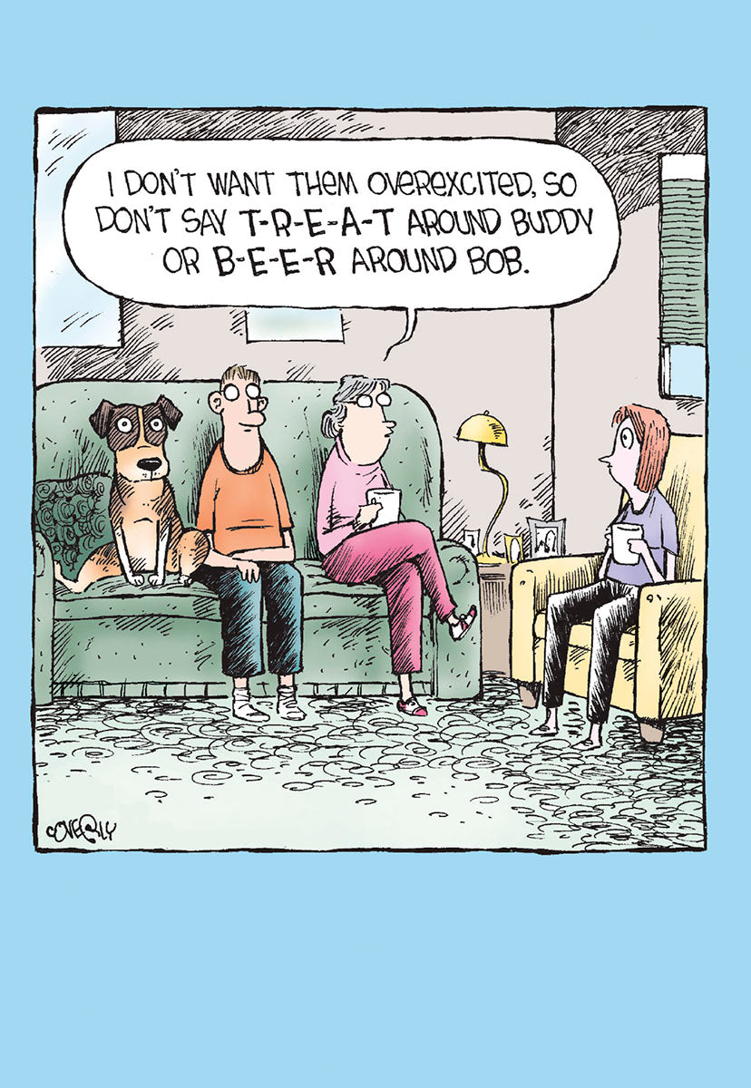 Front: I don’t want them overexcited, so don’t say T-R-E-A-T around Buddy or B-E-E-R around Bob.