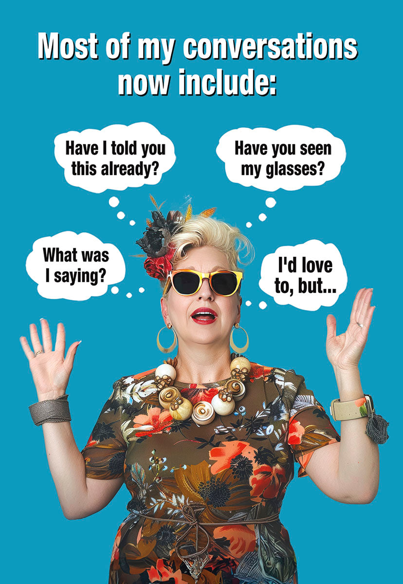 Front: Most of my conversations now include: Have I told you this already? Have you seen my glasses? What was I saying? I’d love to, but…