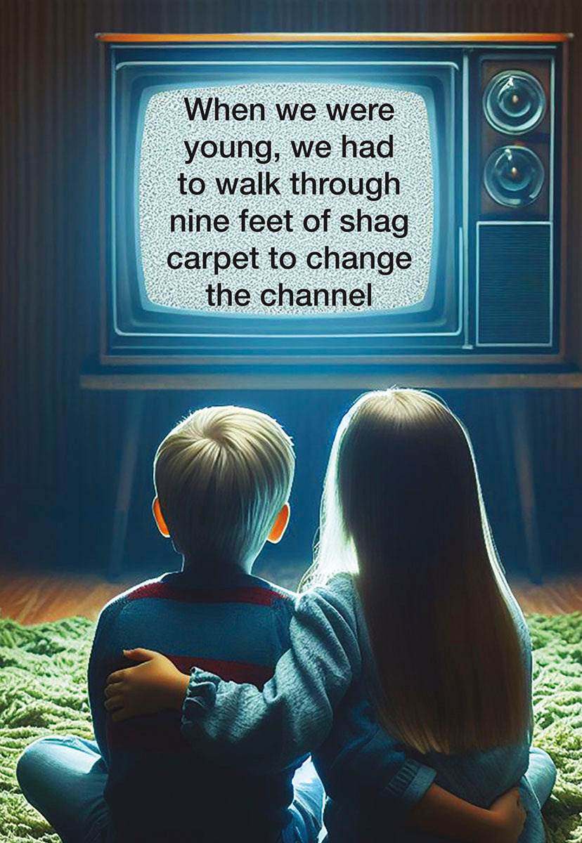 Front: When we were young, we had to walk through nine feet of shag carpet to change the channel