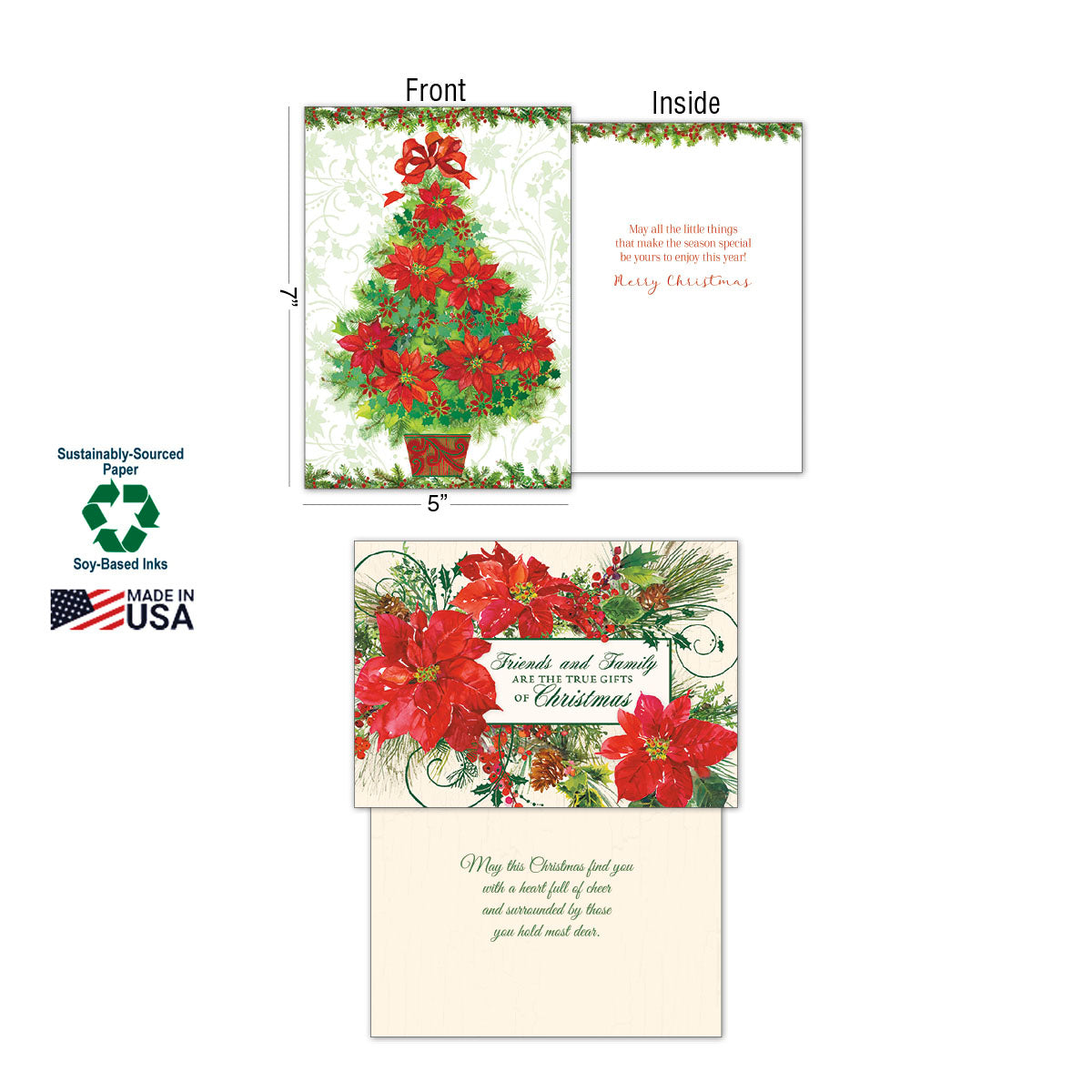 This Merry and Bright Christmas Card Assortment includes 20 beautifully designed cards featuring 10 unique designs, with two of each. Accompanied by 22 coordinating envelopes and presented in an elegant portfolio, these cards are perfect for sharing warm holiday wishes with friends, family, and colleagues. Printed on sustainably sourced paper using soy-based inks, this assortment reflects a commitment to quality and environmental responsibility. Proudly made in the U.S.A., it offers a thoughtful and eco-conscious way to celebrate the season.