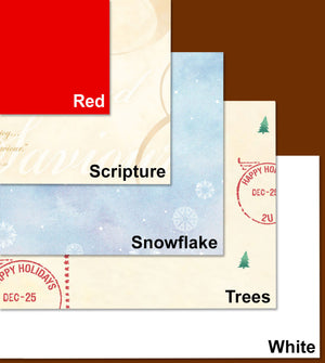 Scripture: Creamy beige background and a soft “Peace on Earth …”(Luke 2:10-11) and festive flourishes.