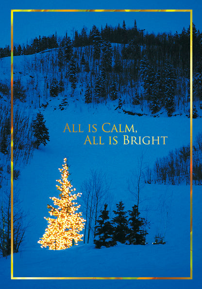 Scripture: Creamy beige background and a soft “Peace on Earth …”(Luke 2:10-11) and festive flourishes.