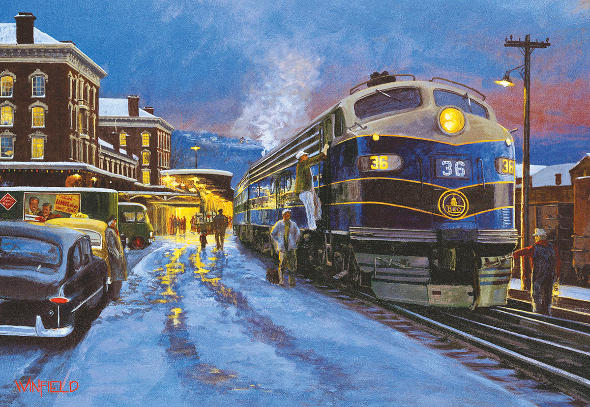 Inside: Greetings of the season with all good cheer for a very Merry Christmas and a Happy New Year! | A Cumberland Christmas A Baltimore and Ohio passenger train pauses at the "Queen City" station in Cumberland, Maryland for a crew change. As passengers board and mail is loaded, a steam helper will be added ahead of the E8 diesels for the westbound climb u