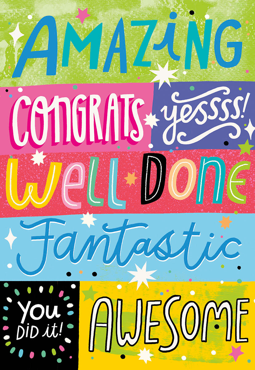Front: AMAZING CONGRATS yessss! WELL DONE Fantastic YOU DID it! AWESOME