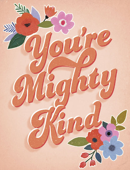 The You're Mighty Kind Thank You Card showcases a vibrant full-color interior with elegant foil and glitter accents, creating a visually striking expression of gratitude. Featuring a custom-trimmed border and accompanied by a colorful envelope, it is ready for immediate use. Crafted on sustainably sourced paper using soy-based inks, this card reflects both quality and environmental responsibility. Proudly made in the U.S.A., it offers a refined and eco-conscious way to convey your appreciation.