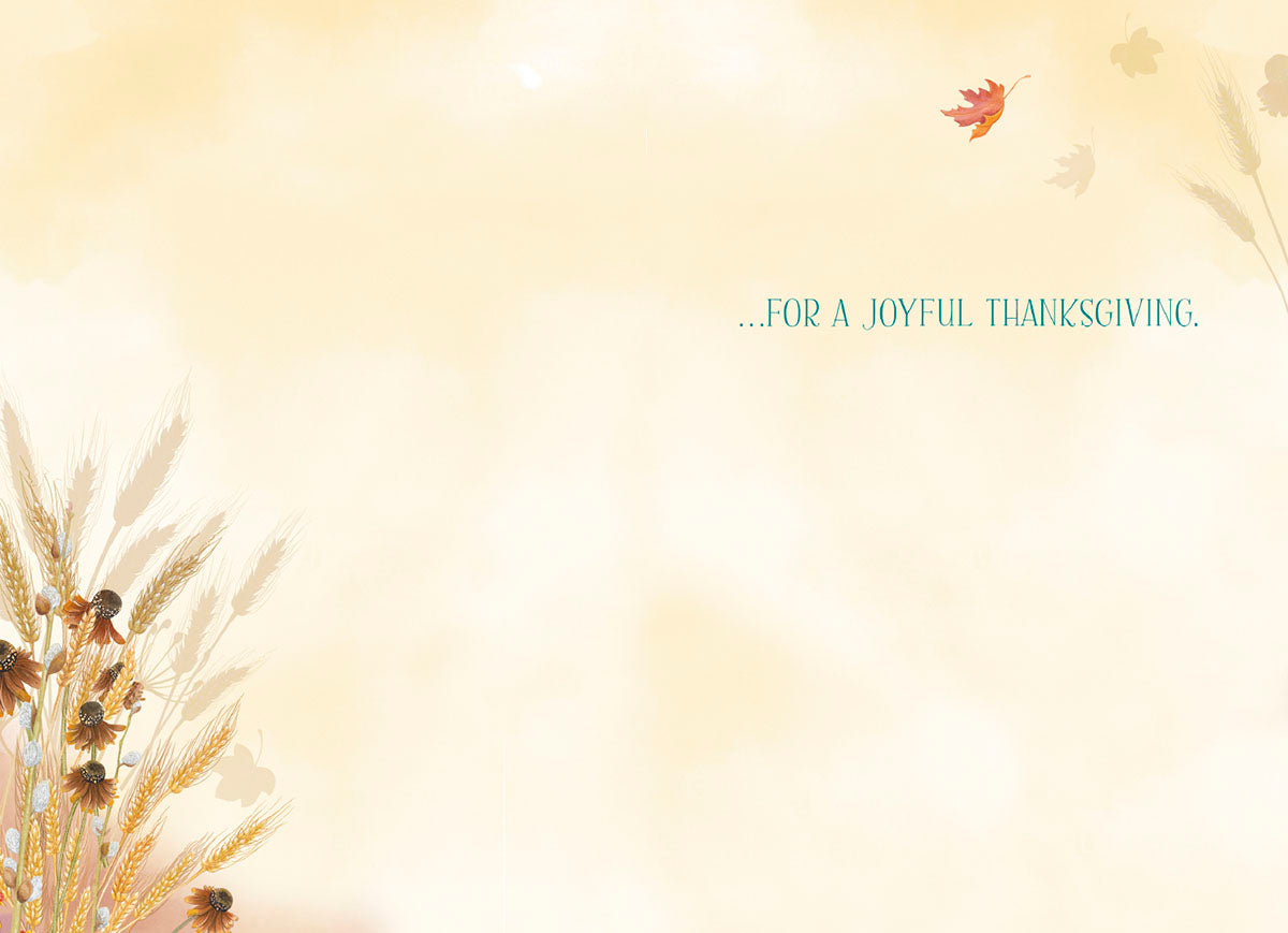 Delight your friends and family with this high-quality Thanksgiving card that's sure to warm the heart and bring lots of smiles. Includes a cheerful, blended-yellow envelope!